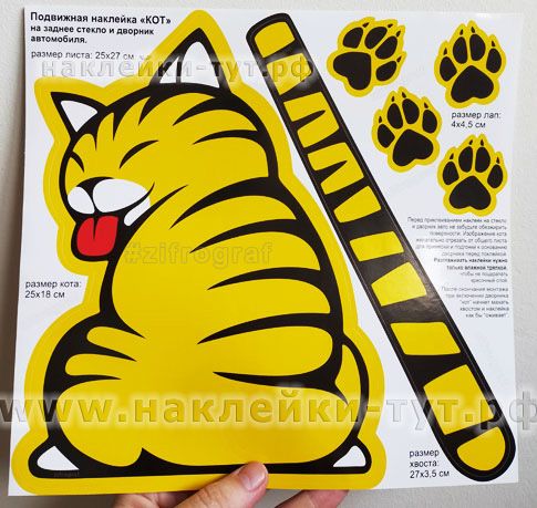 Размер листа с наклейками: 25х27 см (кот размером 25х19 см, его хвост 25х3,5 см, а лапы 4х4,5 см).