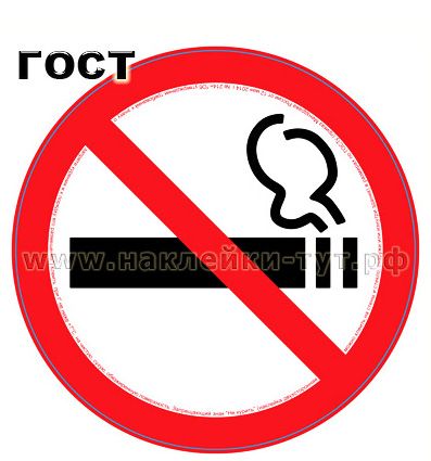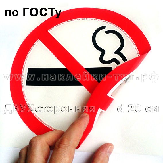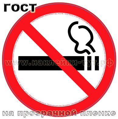 Вы можете у нас знак наклейку НЕ КУРИТЬ купить диаметром 20 см (от 5 руб. оптом) по ГОСТу - согласно требованиям Минздрава России (приказ от 12 мая 2014 г. № 214н "Об утверждении требований к знаку о запрете курения и к порядку его размещения"). Наша наклейка курить запрещено универсальная - двухсторонняя, на прозрачной пленке - клеить можно не только на стены, но и на стекла, витрины, стеклянные перегородки - как снаружи, так и изнутри помещений, магазинов, офисов, автобусов). Наклеенные изнутри наши наклейки "Не курить" невозможно содрать снаружи, покарябать или на ней что-то написать, да и срок службы их увеличивается в 2 раза. Фасовка по 100 шт.