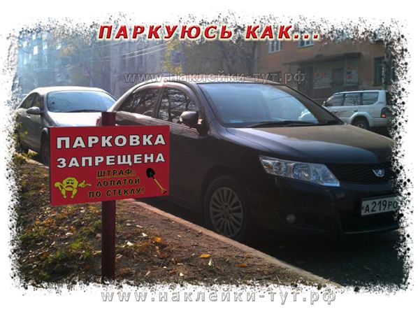Карманный стикер "ПАРКОВКА ЗАПРЕЩЕНА! Штраф лопатой по стеклу!" (от 5 руб.) прекрасное недорогое дополнение, так называемая мини наклейка из серии "СтопХам - мне плевать на всех", которая позволит сэкономить любому, даже не представителю данного движения на расходах для хамов парковок. Он печатается на тонкой бумажной самоклейке, применяемой для "бумажных пломб", поэтому даже наклеенный на стекло (сухое стекло) - прилипает так, что со временем плохо отдирается и с трудом смывается водой (хотя возможно может потребоваться и растворитель для удаления остатков клея), главное клеить на чистое, сухое стекло и прижать посильнее, особенно края. Размер наклейки: 13х13х18 см.