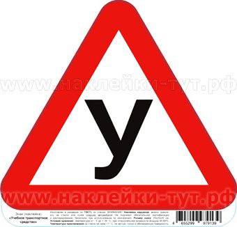 Вы можете купить у нас наклейки знак "Учебный автомобиль" ОПТОМ от 4 руб. по ГОСТу (размер 20х20х20 см), наклейка водостойкая из пленки, вырезана по контуру (углы скругленные), имеет инструкцию и штрих-код товара: 4655299979139, фасовка по 50-100 шт., наших выходных данных (телефонов и адреса сайта) на наклейке нет!!!