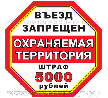 Знак - наклейка "Въезд запрещен - охраняемая территория - ШТРАФ 5000 рублей!" для запрета въезда на вашу территорию. Печатаем в размерах: 15х15, 22х22, 32х32 см.