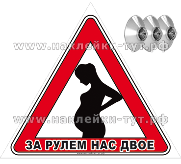Наклейка или знак на присосках на стекло автомобиля "За рулем нас двое!" (от 50 руб.). Если вы или ваша жена беременная за рулем - нужно предупредить об этом окружающих водителей. Данный знак и сообщает об этом всем - сигналить не надо, напугаете беременную и её малыша. Купить автомобильный знак на тонком пластике с 3-мя присосками или наклейку для беременных женщин в машине вы можете в нашем интернет-магазине.
