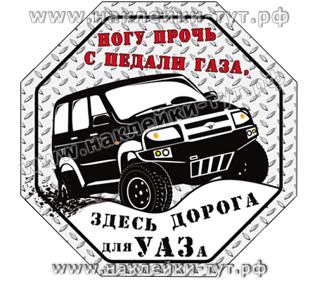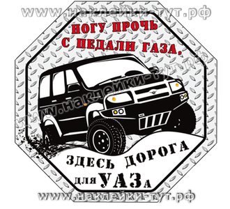 Наклейки для владельцев УАЗов и других внедорожников - "Ногу прочь с педали газа - здесь дорога для УАЗа!" Сегодня Российское бездорожье требует надежных полноприводных машин 4х4 и УАЗ (будь-то 452, 469, 3151, Хантер, Патриот или Симбир) десятилетиями доказывает свое преимущество в этом в армии и на гражданке.