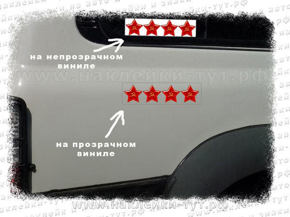 Наклейка на авто "Звезды в ряд за сбитый..." (от 9 руб. оптом) из серии "День Победы - 9 Мая!" предназначена для обозначения в наше время так называемых "сбитых вражеских транспортов" - словно в годы войны на бортах наших машин за сбитые самолеты или подбитые танки врага. Многие наклеивают не одну, а 2 или 3 наклейки со звездами в ряд, увеличивая количество "сбитых". Поддержи наших ветеранов - наклей этот стикер на своё авто к 70-летию Великой Победы. Купить наклейку со звездами можно в размере: 7х30 см - либо на непрозрачном белом виниле (см прилагающиеся фото), либо на прозрачном виниле (рекомендуется только для наклеивания на авто со светлыми цветами кузова - на темных кузовах и стеклах звезды будут еле видны, т. к. краска полупрозрачная!!!).